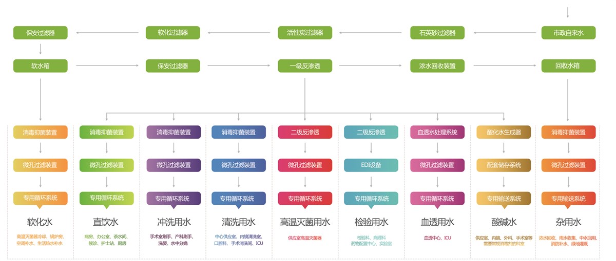 醫(yī)院集中分質(zhì)供水系統(tǒng)是用一套水處理系統(tǒng)對自來水進(jìn)行深度處理,使其達(dá)到各科室可直接使用的水質(zhì)標(biāo)準(zhǔn),再分別由專用管網(wǎng)供給各科室使用的供水系統(tǒng)。